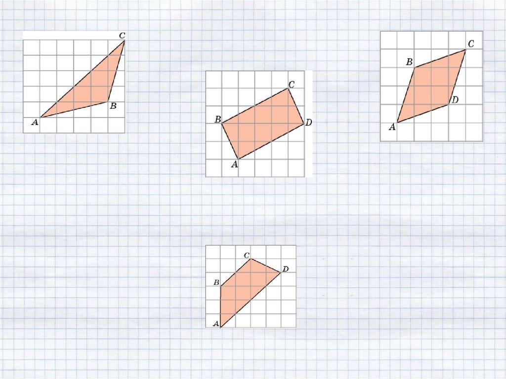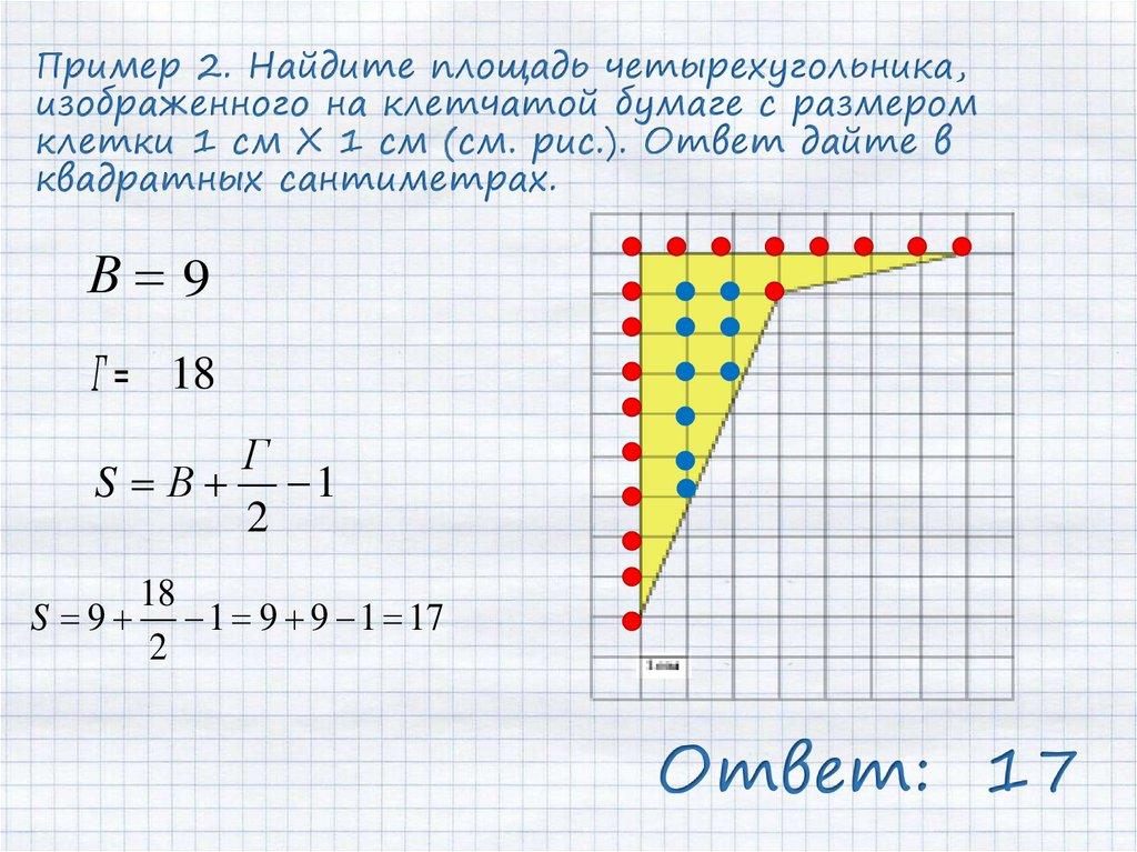 Пример 2. Найдите площадь четырехугольника,изображенного на клетчатой бумаге с размером