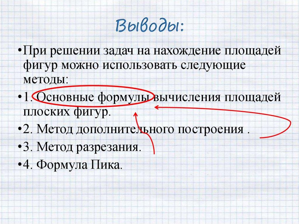 Выводы:•При решении задач на нахождение площадей