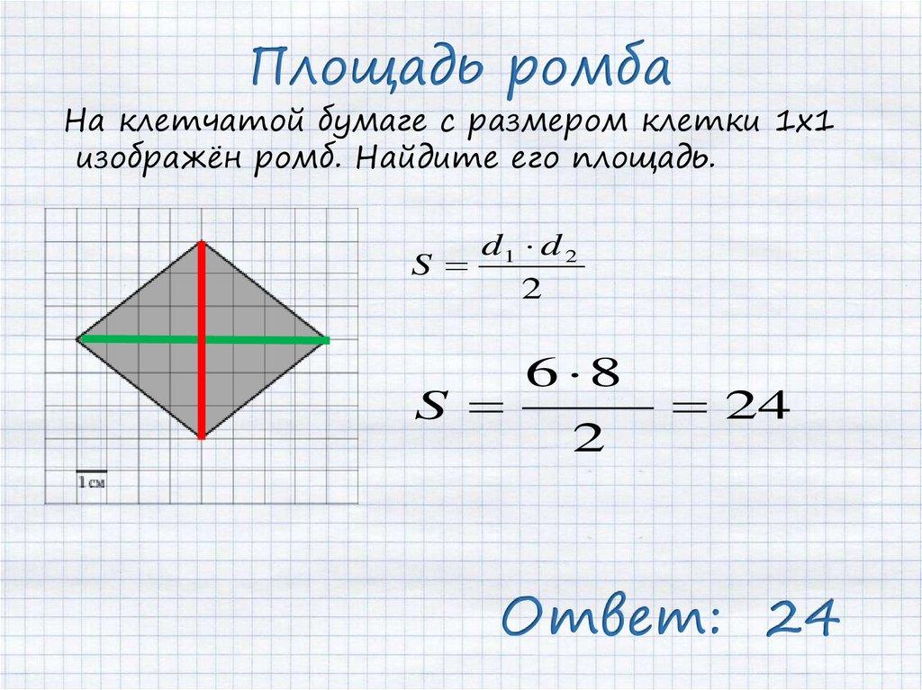 Площадь ромбаНа клетчатой бумаге с размером клетки 1х1