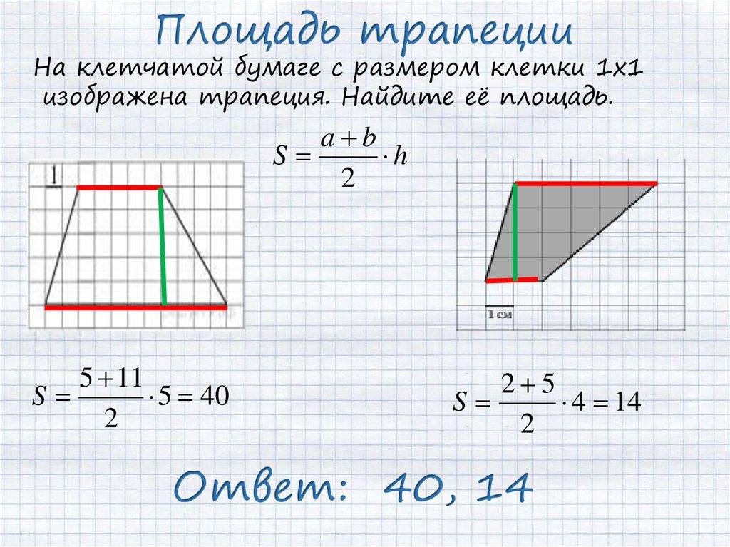 Площадь трапецииНа клетчатой бумаге с размером клетки 1х1
