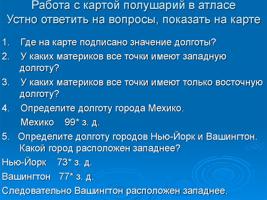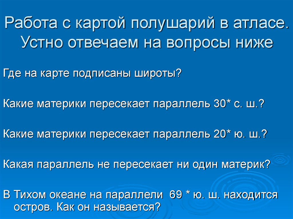 Работа с картой полушарий в атласе.Устно отвечаем на вопросы ниже