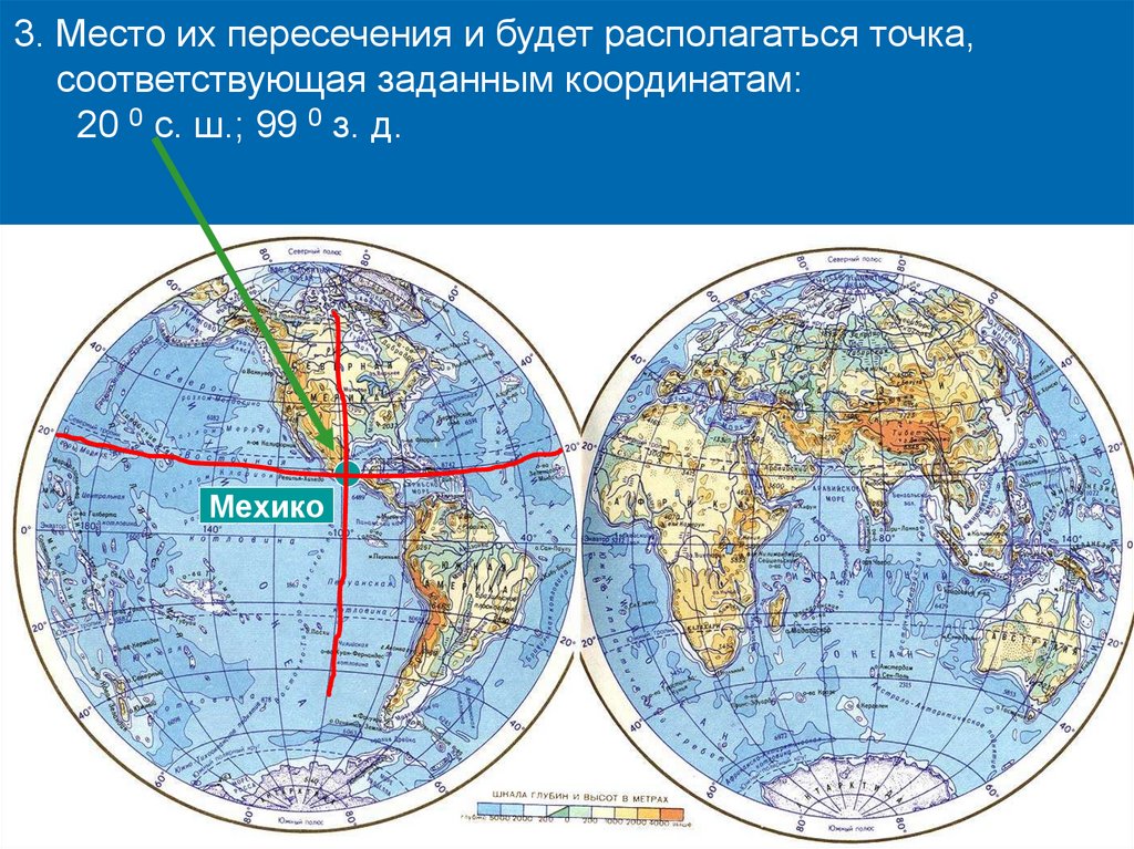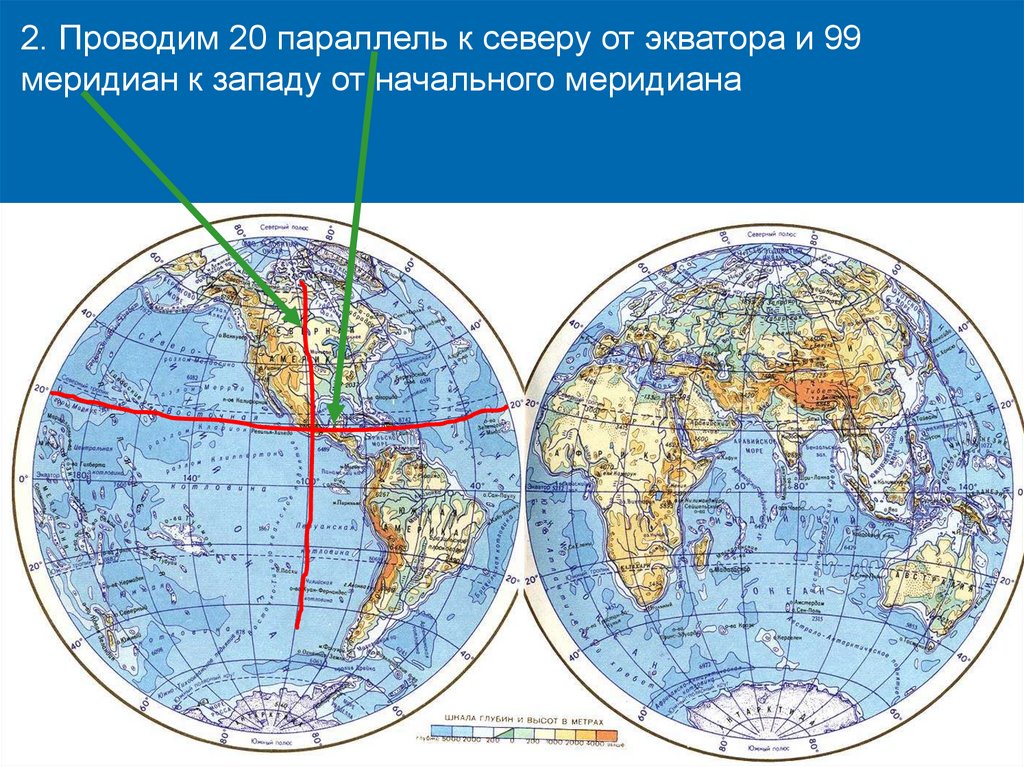 2. Проводим 20 параллель к северу от экватора и 99меридиан к западу от начального меридиана