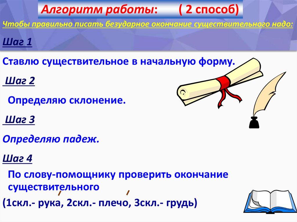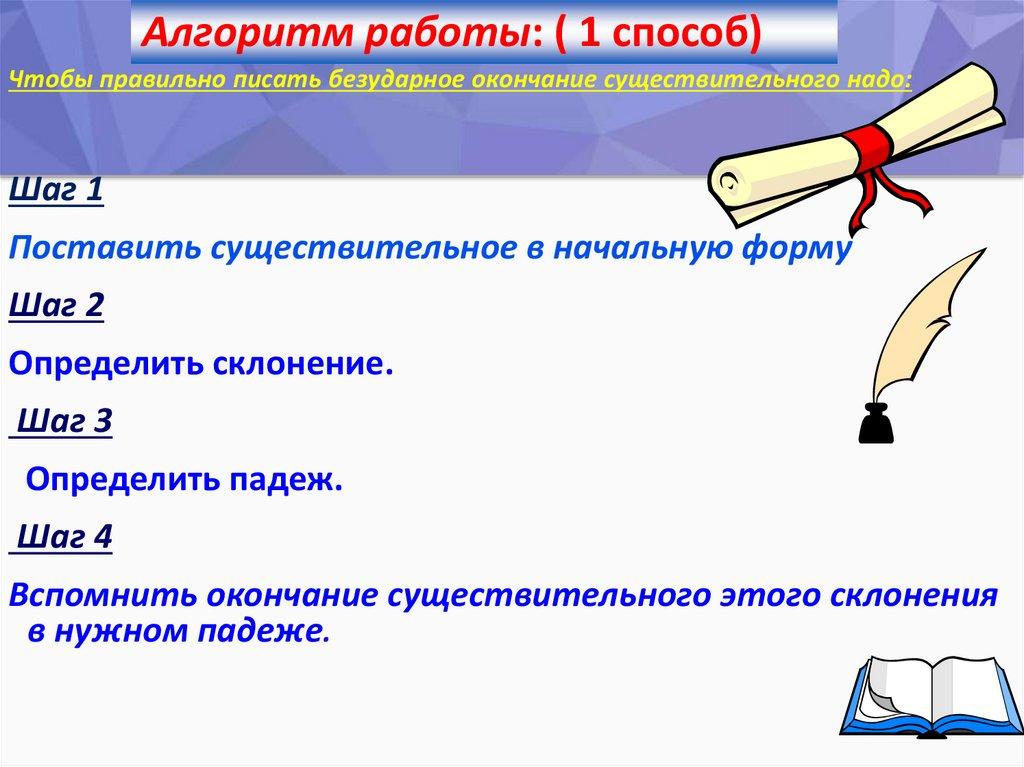 Алгоритм работы: ( 1 способ)Чтобы правильно писать безударное окончание существительного надо: