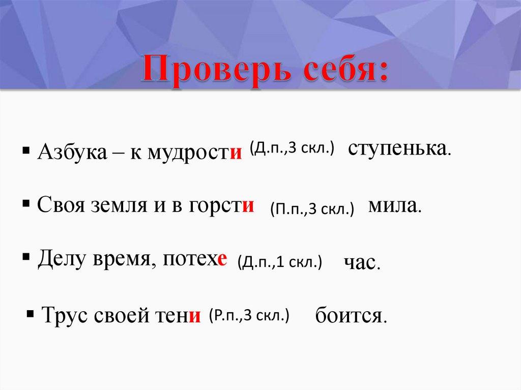 Азбука – к мудрости (Д.п.,3 скл.) ступенька.Своя земля и в горсти (П.п.,3 скл.) мила.