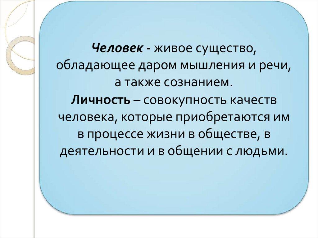 Человек - живое существо,обладающее даром мышления и речи,