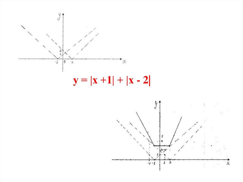 32. 4 способ. Путём сложения ординат графиков функций соответствующих одним и тем же абсциссам Пример: y=|x+1|+|x-2|
