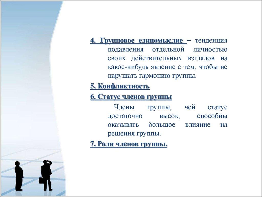 4. Групповое единомыслие – тенденцияподавления отдельной личностью