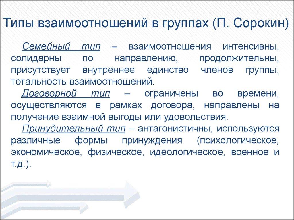 Типы взаимоотношений в группах (П. Сорокин)Семейный тип – взаимоотношения интенсивны,