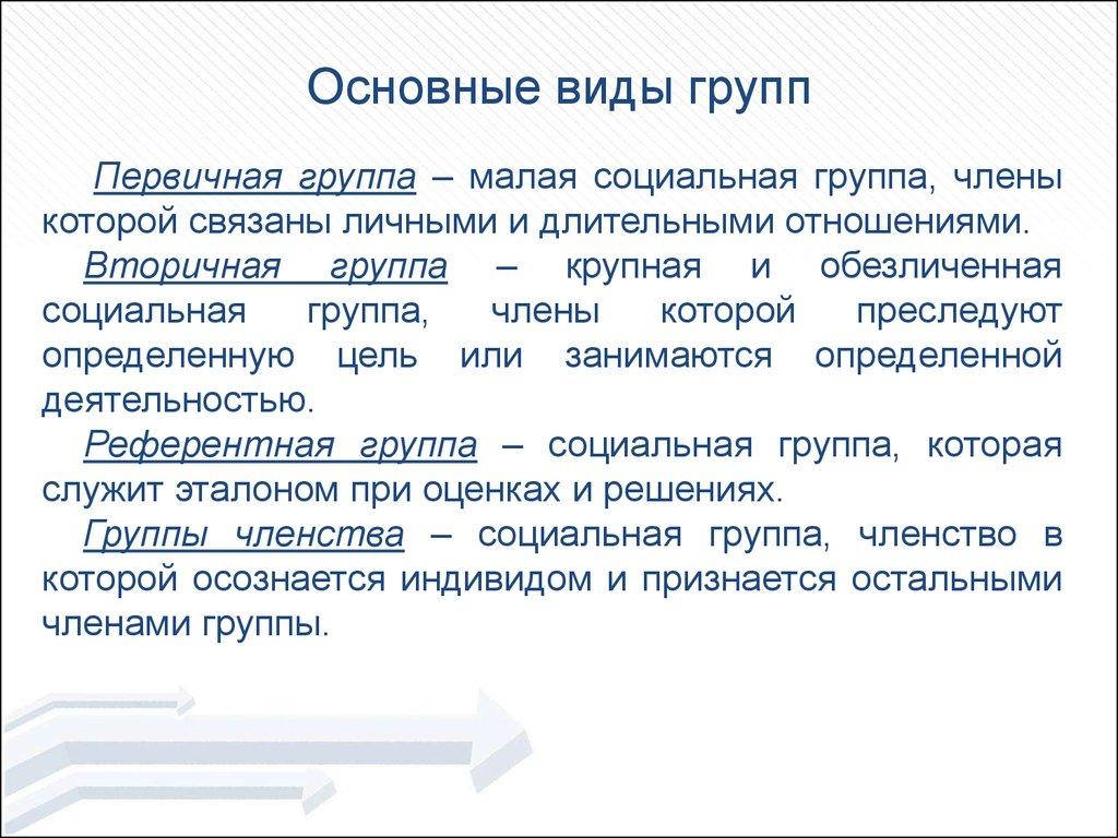 Основные виды группПервичная группа – малая социальная группа, члены