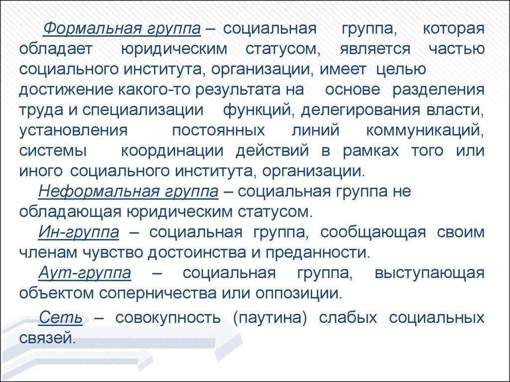 Формальная группа – социальная группа, котораяобладает