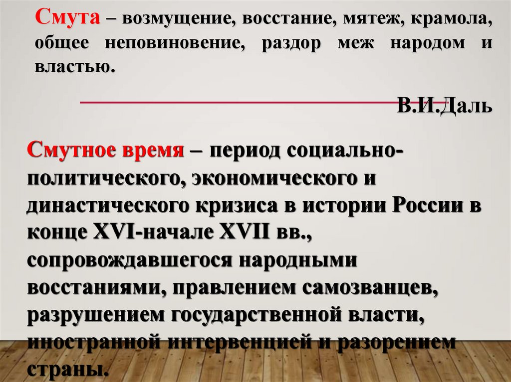 Смута – возмущение, восстание, мятеж, крамола,общее неповиновение, раздор меж народом и