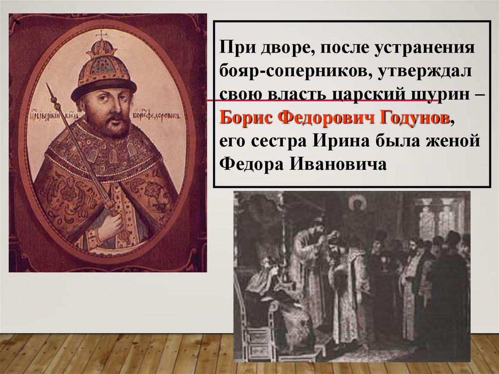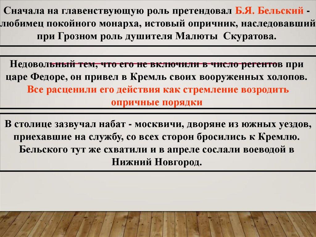 Сначала на главенствующую роль претендовал Б.Я. Бельский любимец покойного монарха, истовый опричник, наследовавшийпри Грозном роль душителя Малюты Скуратова.