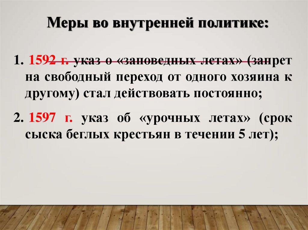 Меры во внутренней политике:1. 1592 г. указ о «заповедных летах» (запрет