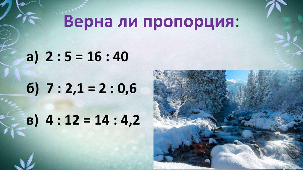 Верна ли пропорция:а) 2 : 5 = 16 : 40