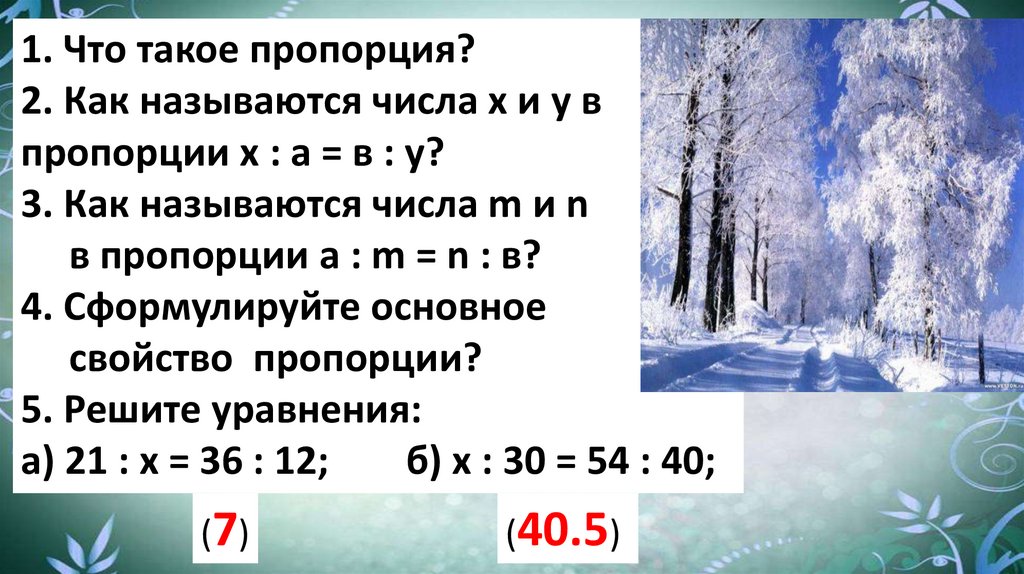 1. Что такое пропорция?2. Как называются числа х и у в