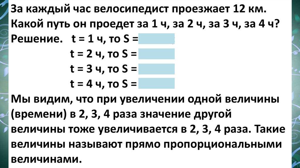 Решение. t = 1 ч, то S = 12 км;
