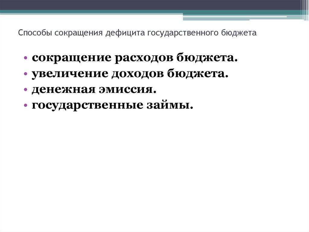 Способы сокращения дефицита государственного бюджета• сокращение расходов бюджета.