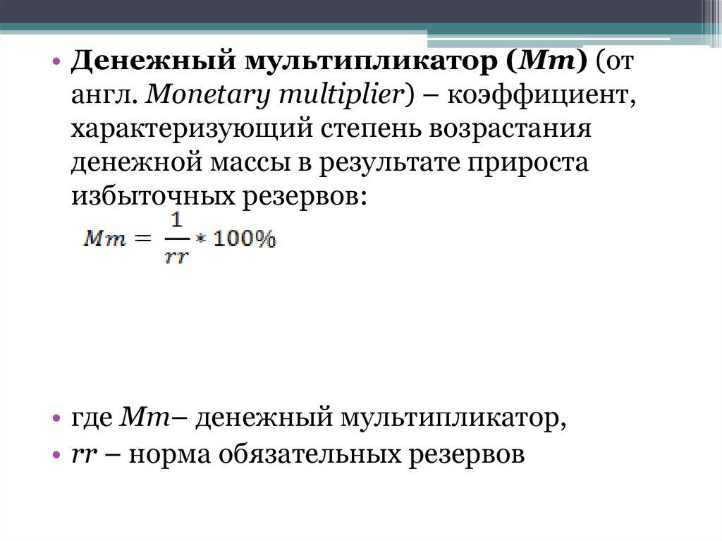 • Денежный мультипликатор (Mm) (отангл. Monetary multiplier) – коэффициент,