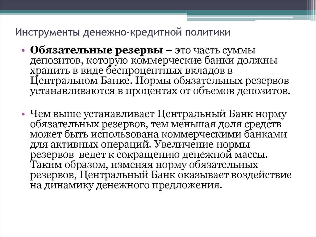 Инструменты денежно-кредитной политики• Обязательные резервы – это часть суммы