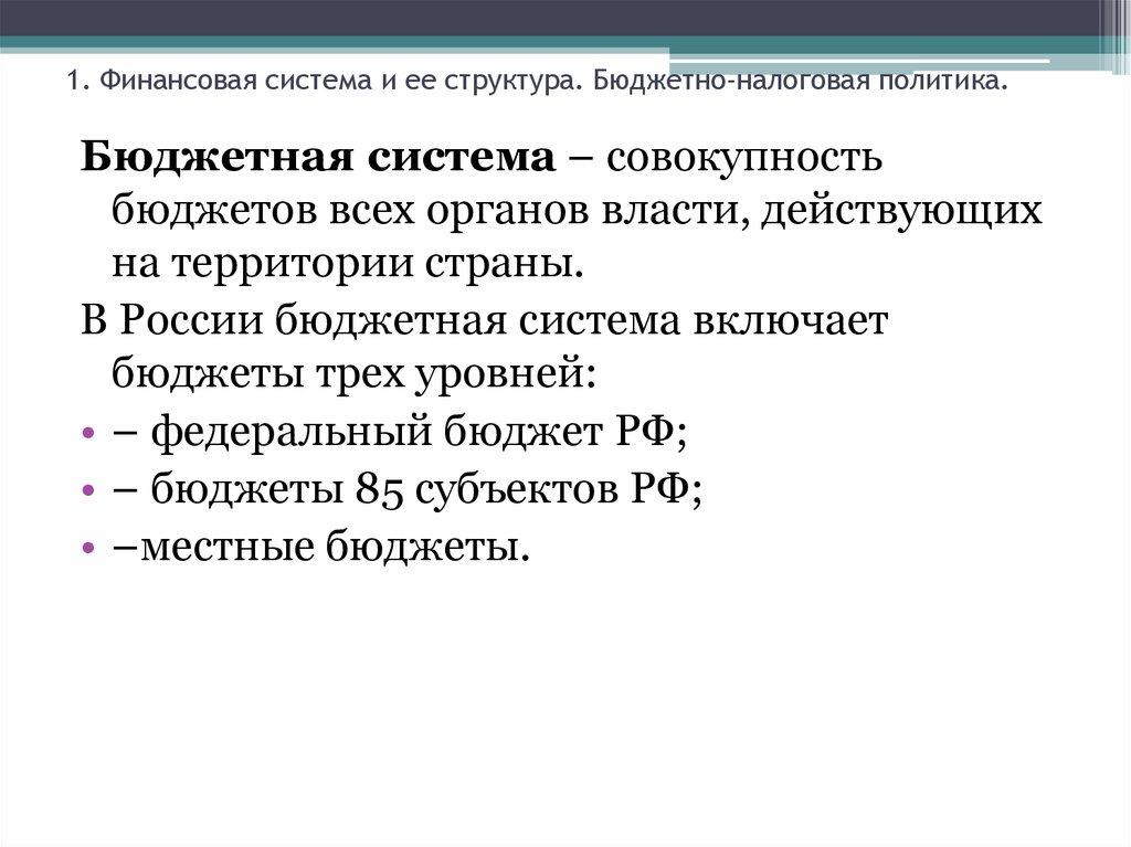 1. Финансовая система и ее структура. Бюджетно-налоговая политика.Бюджетная система – совокупность