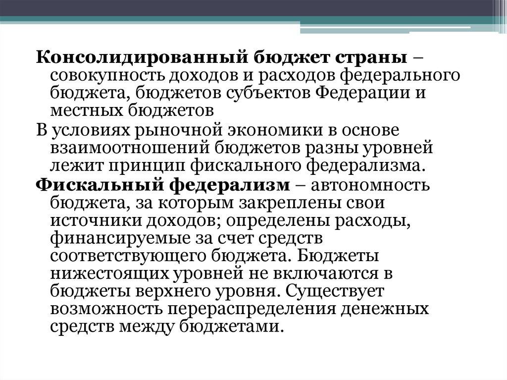 Консолидированный бюджет страны –совокупность доходов и расходов федерального