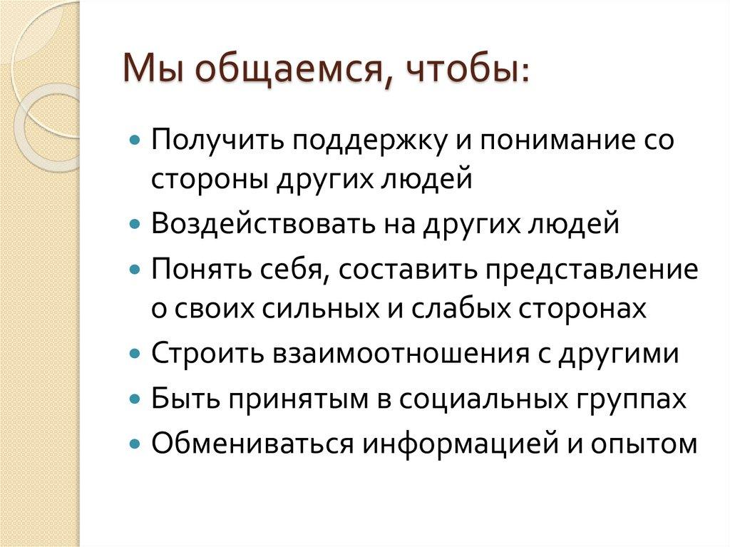 Мы общаемся, чтобы:Получить поддержку и понимание со