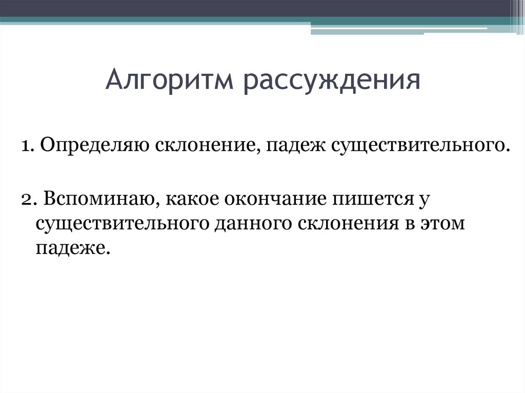 Алгоритм рассуждения1. Определяю склонение, падеж существительного.