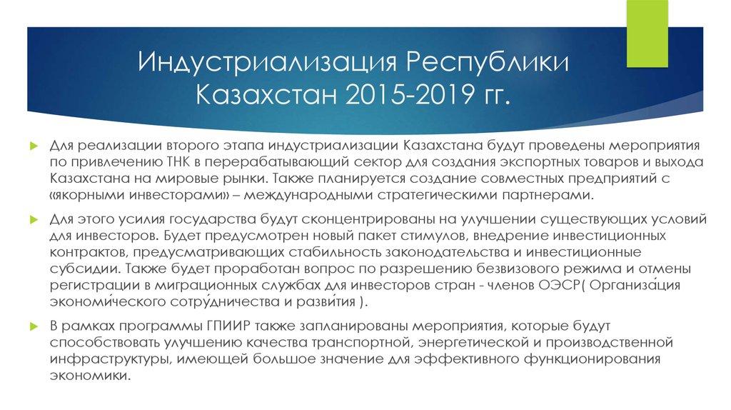 Для реализации второго этапа индустриализации Казахстана будут проведены мероприятияпо привлечению ТНК в перерабатывающий сектор для создания экспортных товаров и выхода