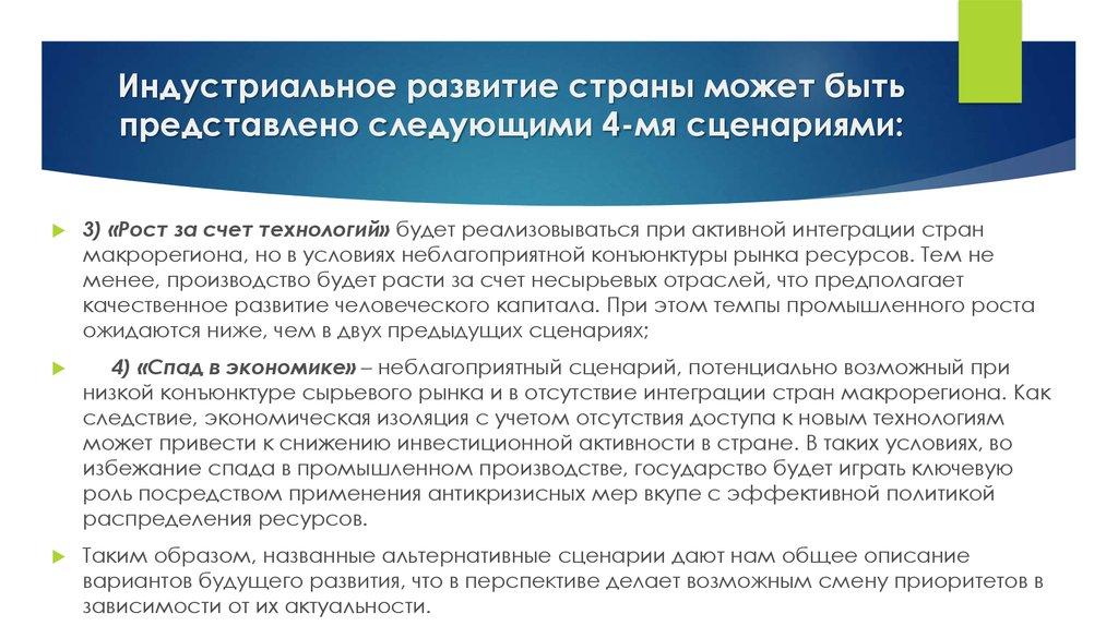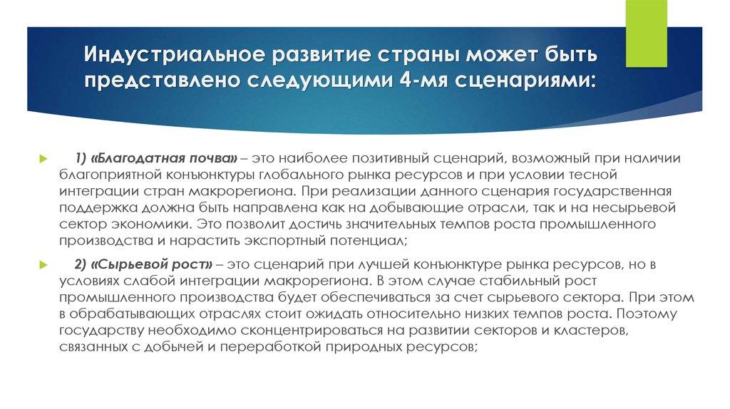23. Индустриальное развитие страны может быть представлено следующими 4-мя сценариями: