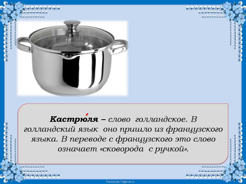 Кастрюля – слово голландское. Вголландский язык оно пришло из французского