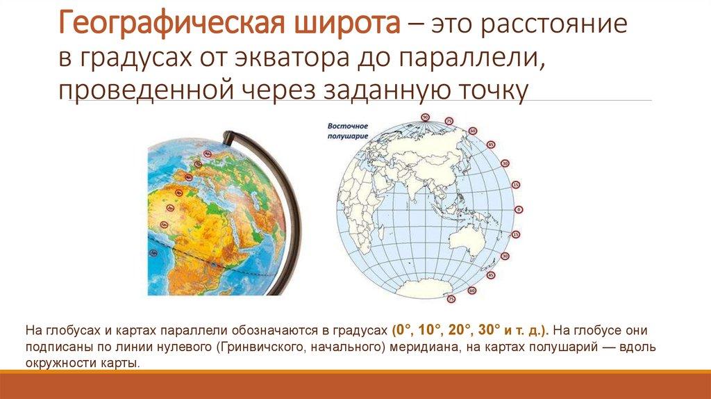 Географическая широта – это расстояниев градусах от экватора до параллели,