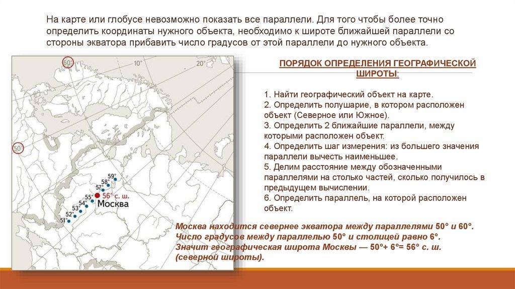 Значит географическая широта Москвы — 50°+ 6°= 56° с. ш.