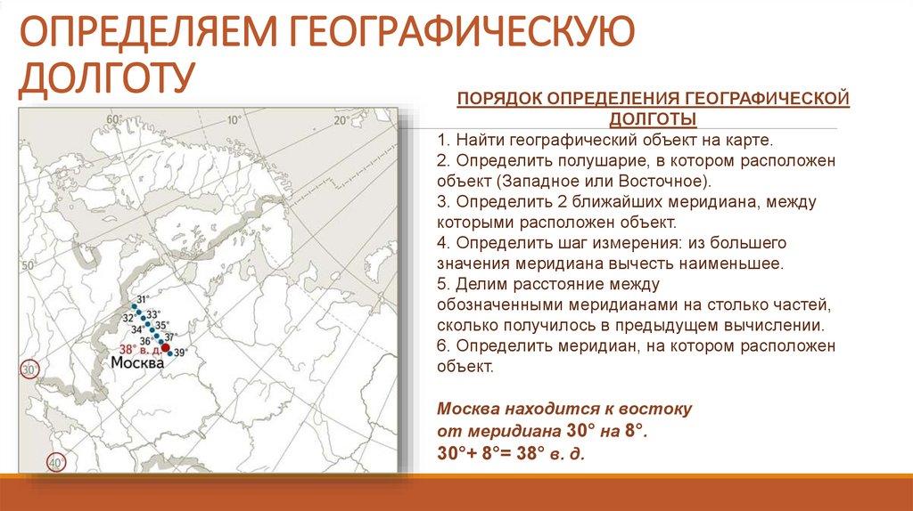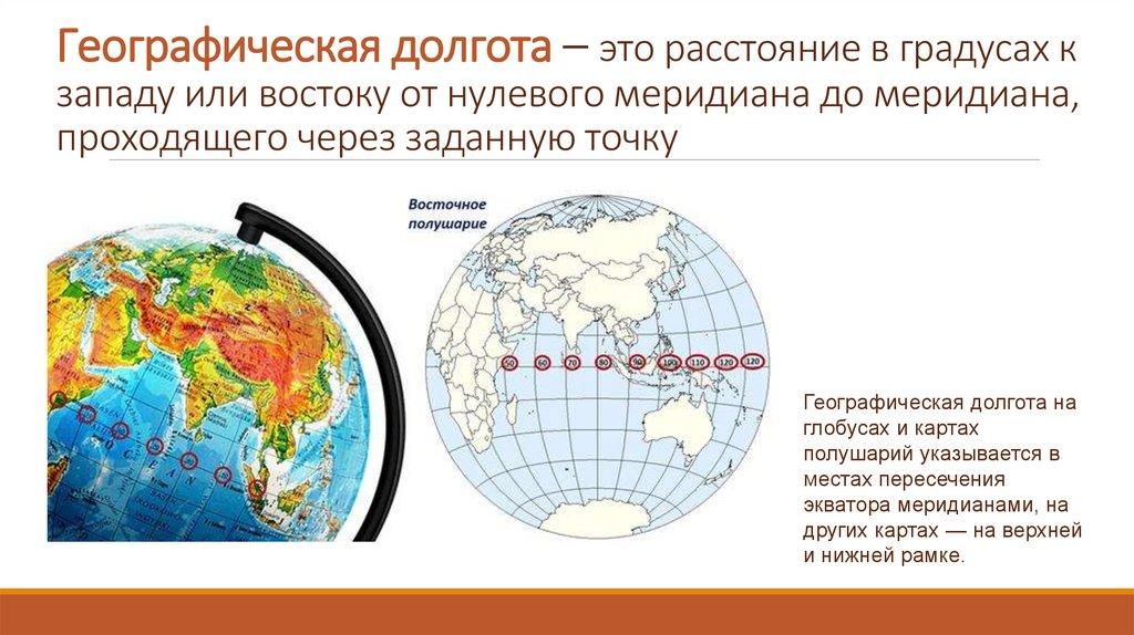 Географическая долгота – это расстояние в градусах кзападу или востоку от нулевого меридиана до меридиана,