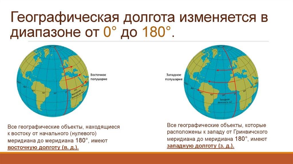 Географическая долгота изменяется вдиапазоне от 0° до 180°.