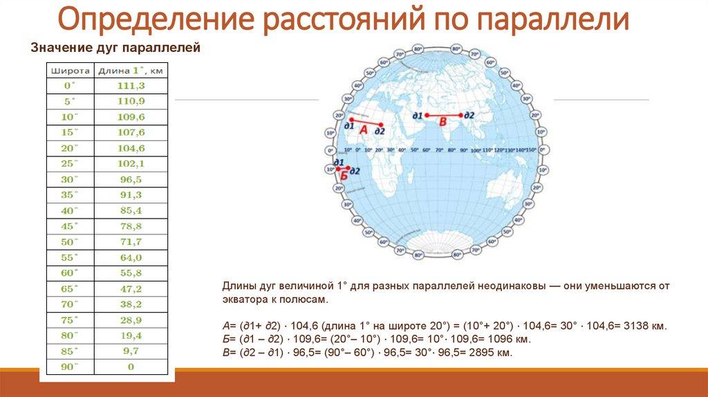 Определение расстояний по параллелиЗначение дуг параллелей