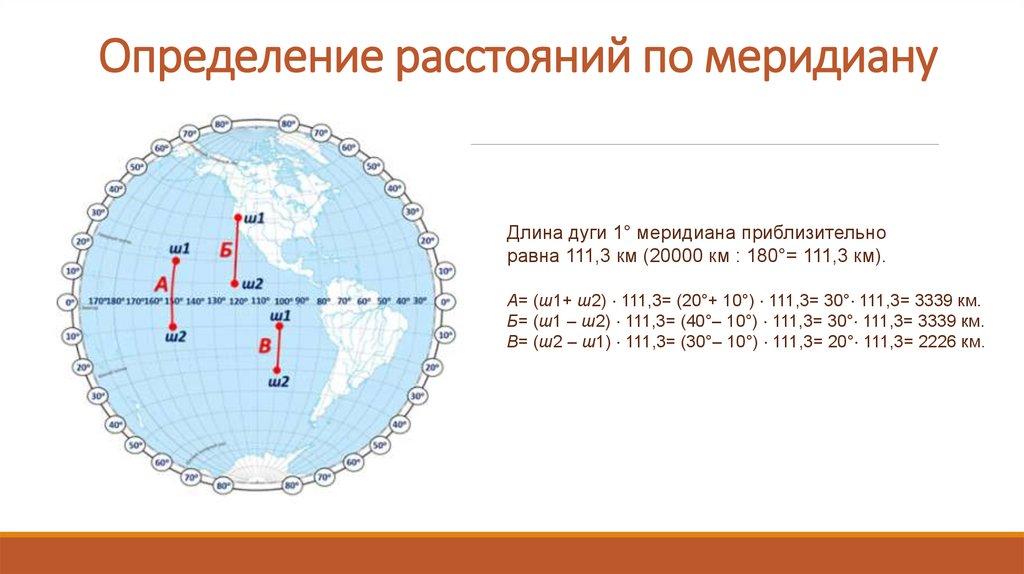 Длина 1° меридиана составляет примерно 111 км.