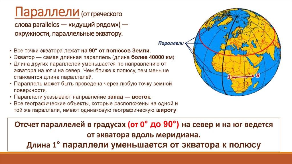 • Экватор — самая длинная параллель (длина более 40000 км).