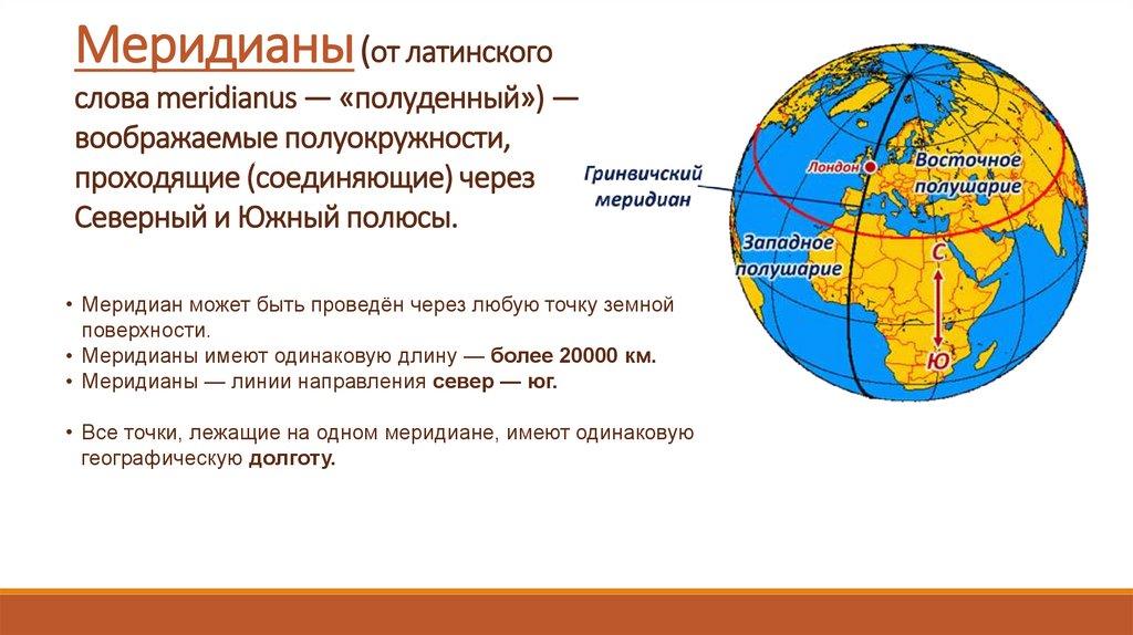 • Все точки, лежащие на одном меридиане, имеют одинаковую