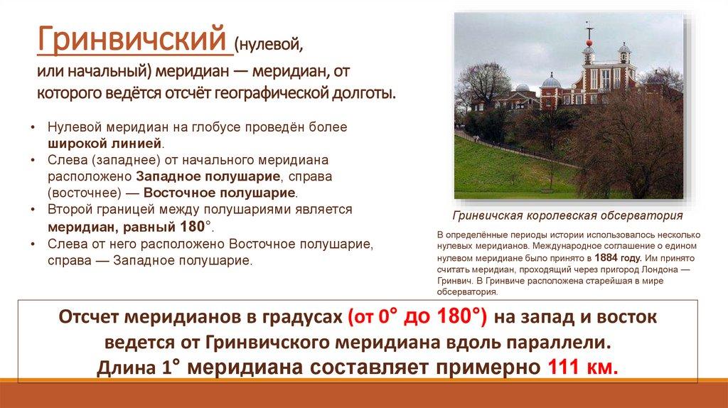 Гринвичский (нулевой,или начальный) меридиан — меридиан, от
