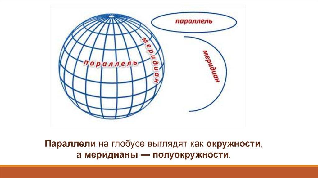 Параллели на глобусе выглядят как окружности,а меридианы — полуокружности.