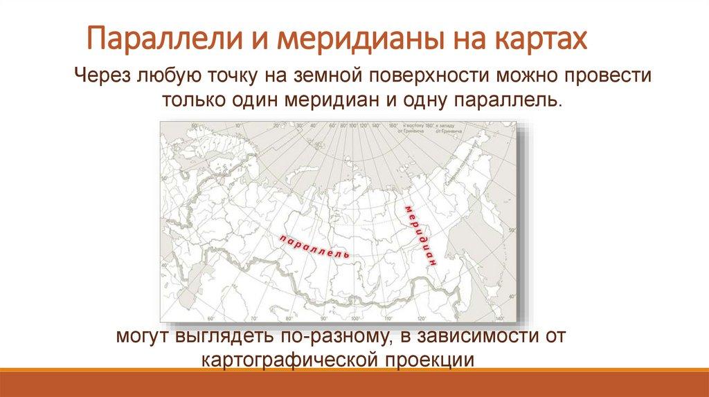 Параллели и меридианы на картахЧерез любую точку на земной поверхности можно провести