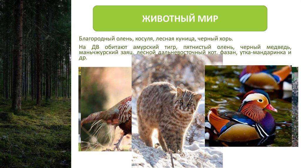 маньчжурский заяц, лесной дальневосточный кот, фазан, утка-мандаринка и