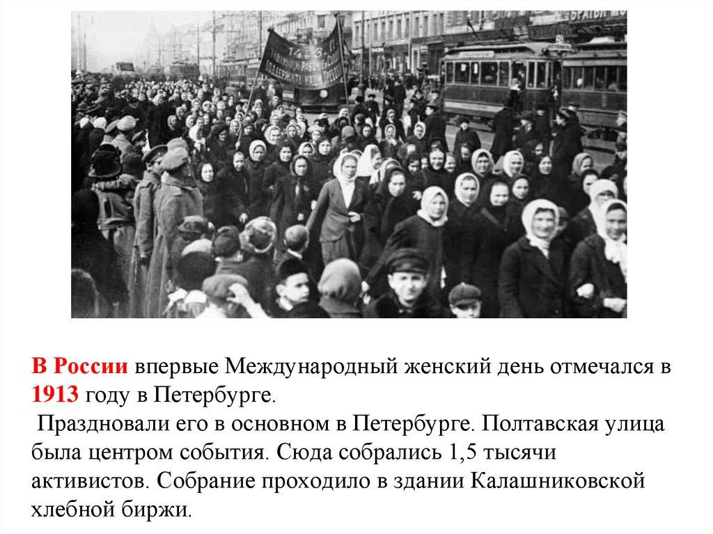 В России впервые Международный женский день отмечался в1913 году в Петербурге.
