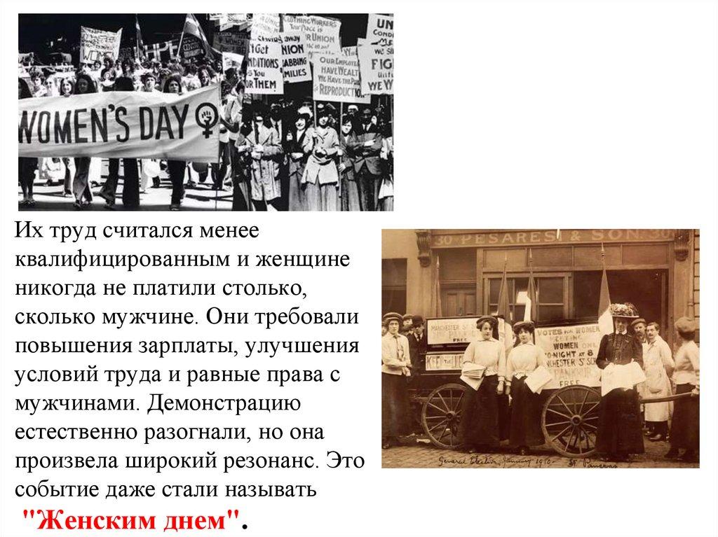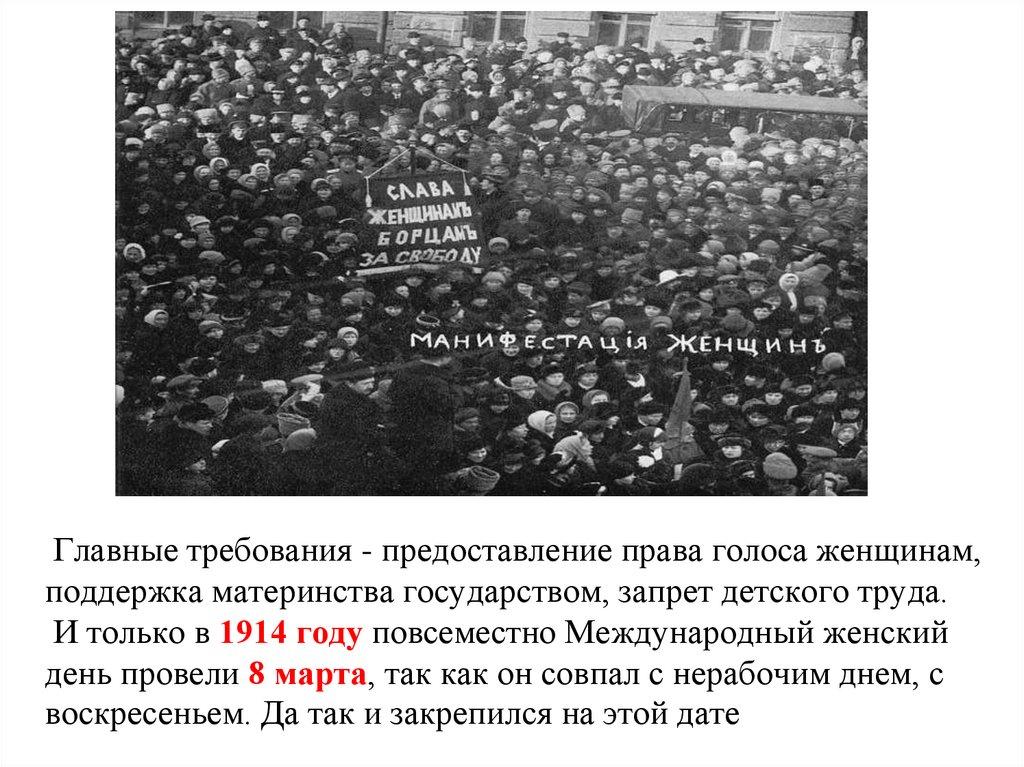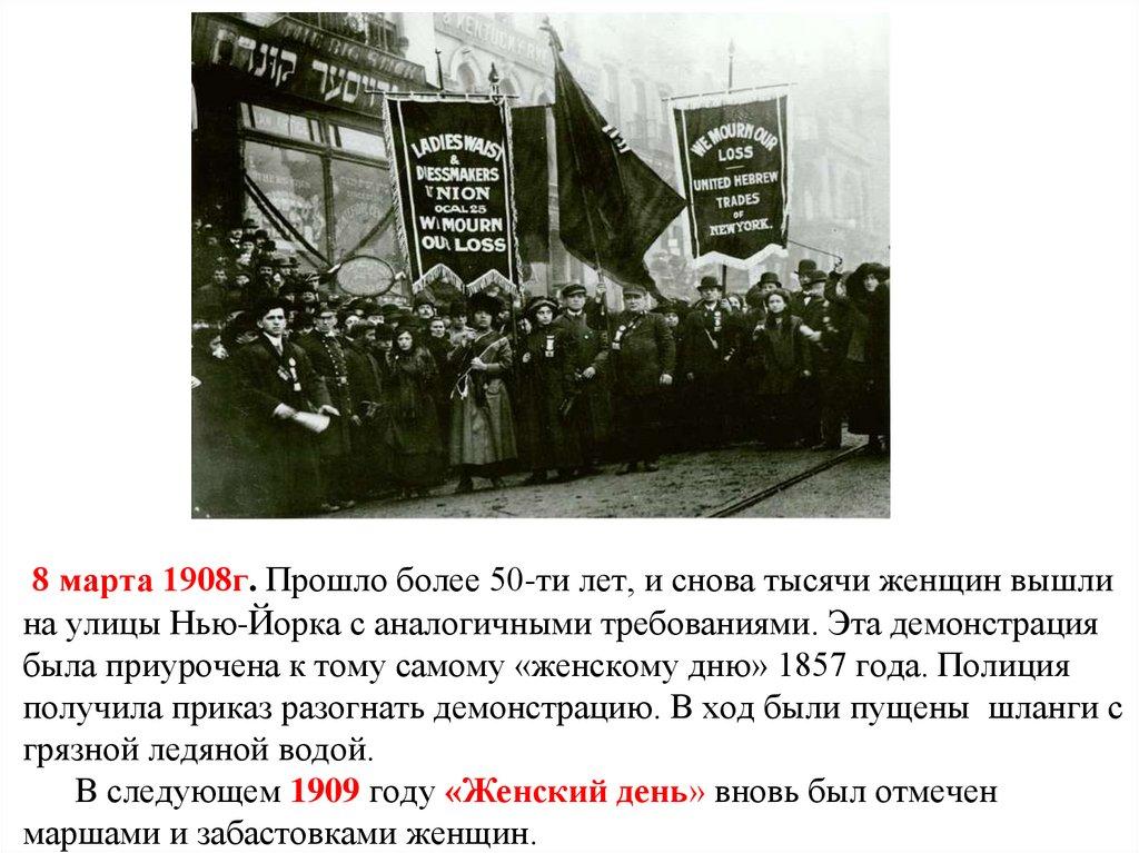8 марта 1908г. Прошло более 50-ти лет, и снова тысячи женщин вышлина улицы Нью-Йорка с аналогичными требованиями. Эта демонстрация