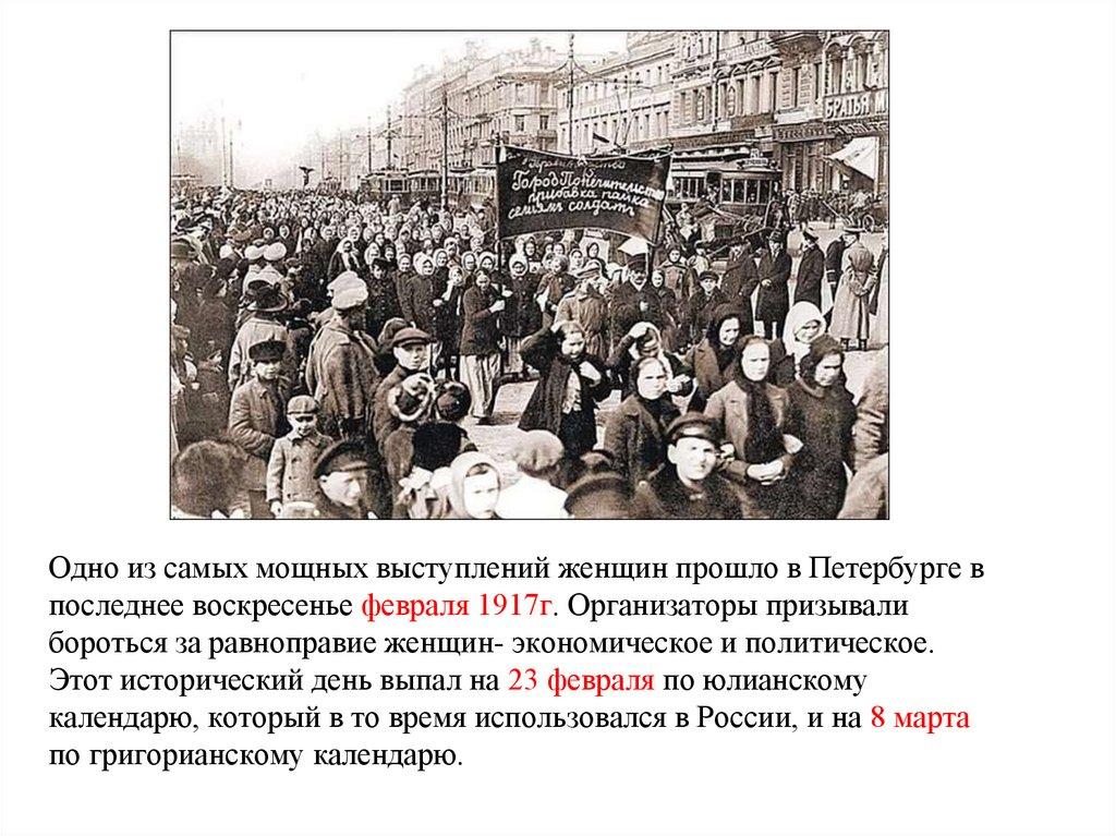 Одно из самых мощных выступлений женщин прошло в Петербурге впоследнее воскресенье февраля 1917г. Организаторы призывали
