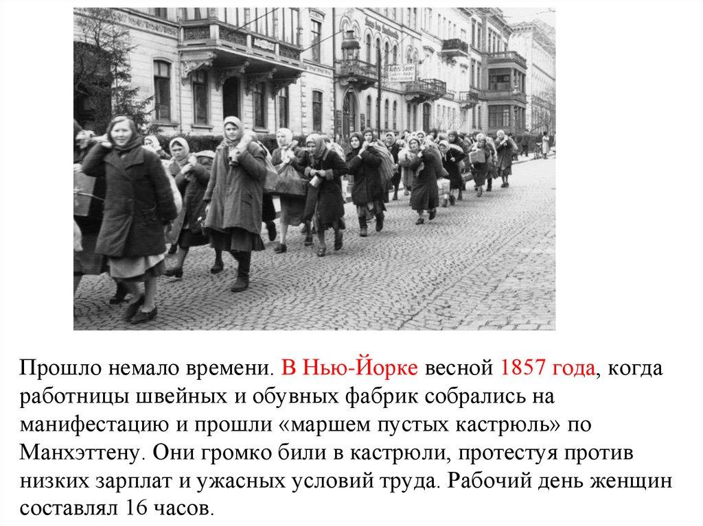 Прошло немало времени. В Нью-Йорке весной 1857 года, когдаработницы швейных и обувных фабрик собрались на