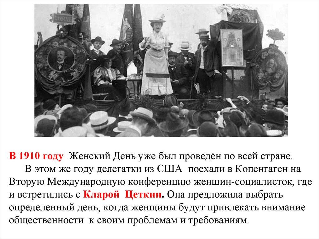В 1910 году Женский День уже был проведён по всей стране.В этом же году делегатки из США поехали в Копенгаген на