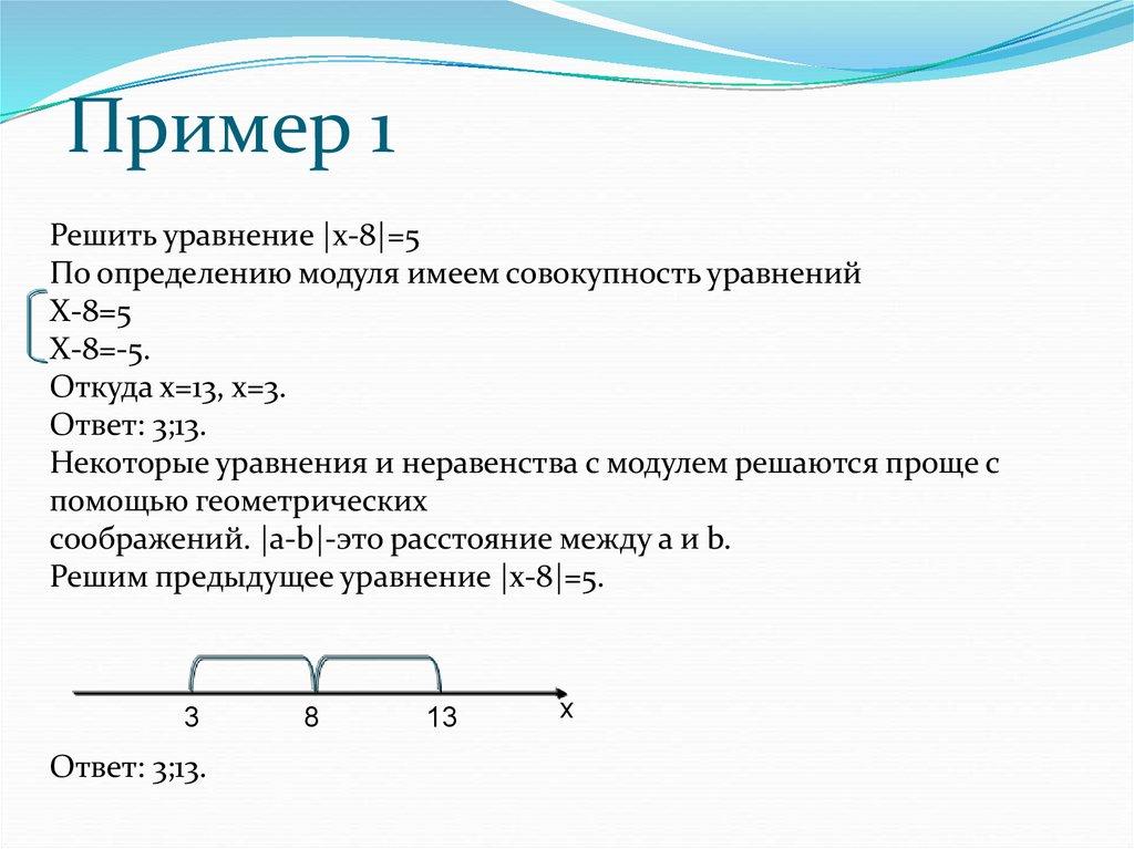 Решить уравнение |х-8|=5По определению модуля имеем совокупность уравнений