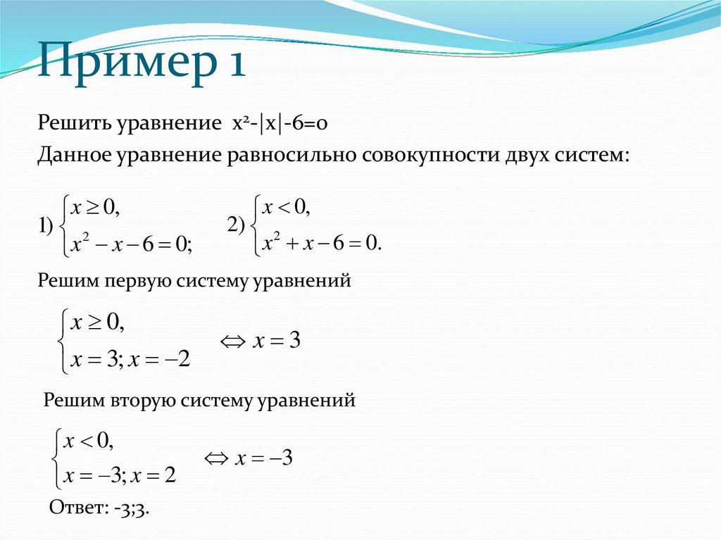 Решить уравнение х2-|х|-6=0Данное уравнение равносильно совокупности двух систем: