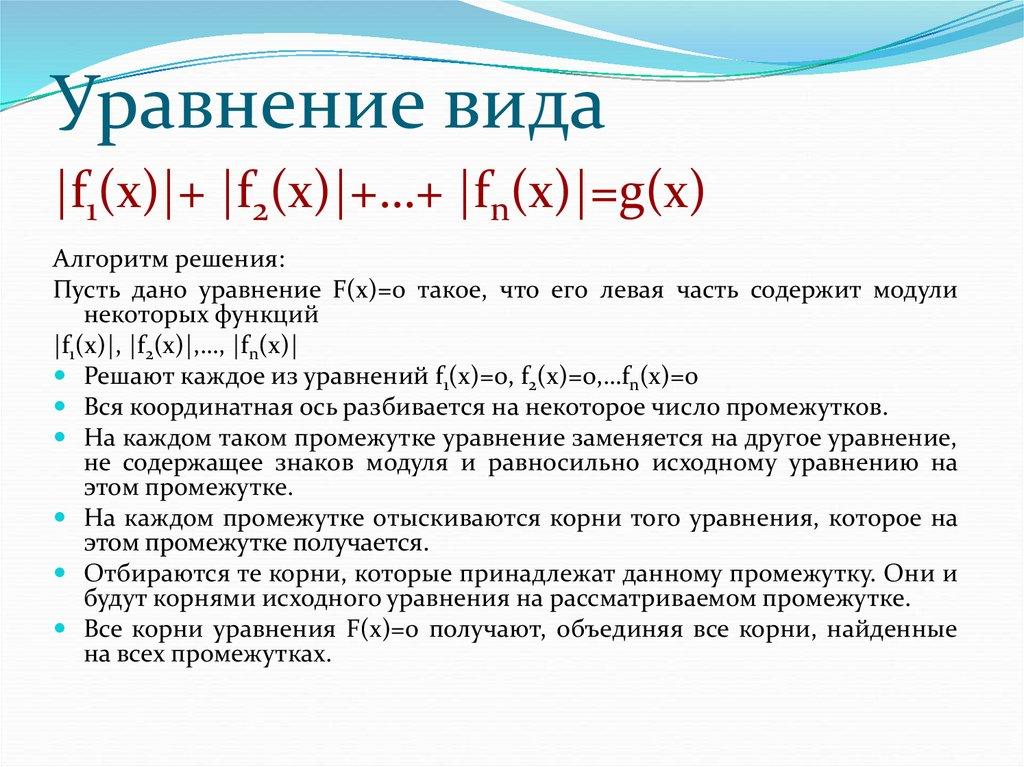 |f1(x)|+ |f2(x)|+…+ |fn(x)|=g(x)Алгоритм решения: